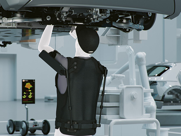 X-ble Shoulder può ridurre il carico sulle spalle fino al 60 percento e lo sforzo muscolare del deltoide anteriore/laterale fino al 30 percento, migliorando nettamente la qualità di vita dei lavoratori.